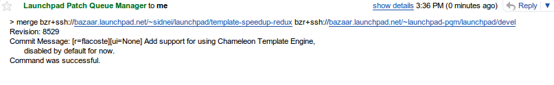 I also had the chance of interacting with the Launchpad team, which has a much more refined process due to the size of their team. Over at Launchpad, I started a branch back in mid-December, even before starting at Canonical, to allow Launchpad to use the Chameleon Template Engine.